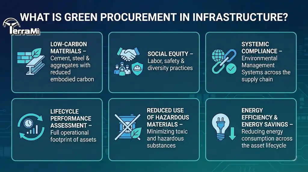 Green procurement is the systematic integration of environmental and social criteria into purchasing decisions, alongside price and quality. In high-stakes infrastructure, this includes: