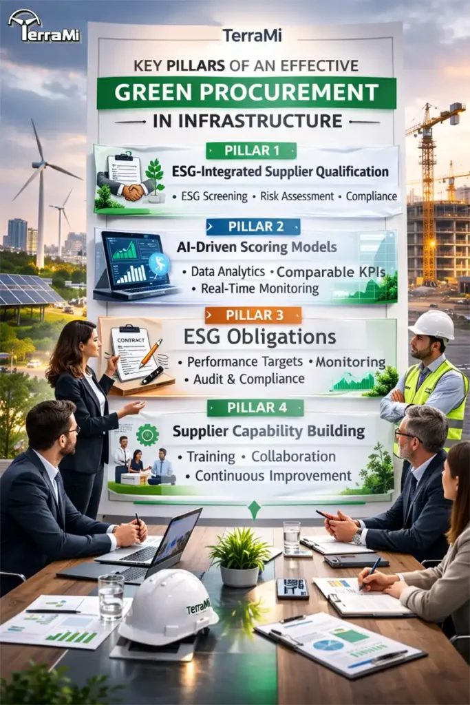 The four pillars of Green Procurement in Infrastructure: ESG-integrated supplier qualification, AI-driven scoring models, ESG obligations, and supplier capability building—embedding sustainability into procurement decisions across infrastructure projects.